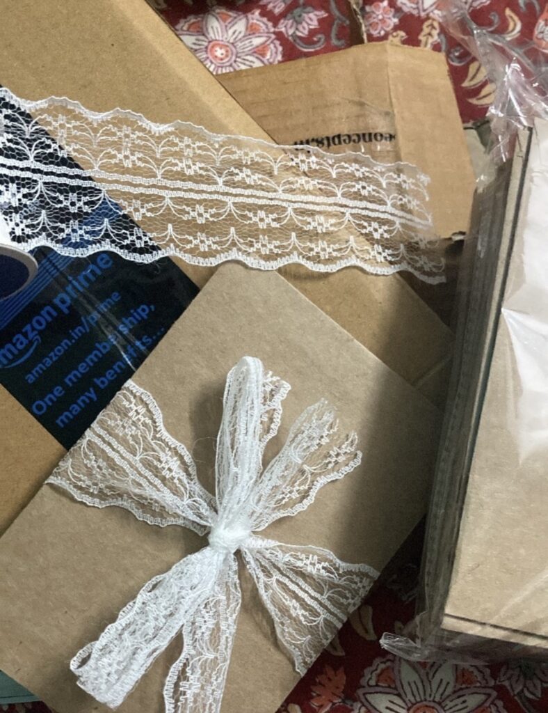 Small orders go in bubble-wrap envelopes with honeycomb paper for cushioning. Bigger orders are packed in carton boxes, again layered with honeycomb paper for safety during shipping. Each piece is placed in a soft organza pouch (sourced from Chandni Chowk) and comes with a thank-you card printed either locally or from an online branding site. Most packaging materials, bubble wrap, envelopes, and boxes — come from Amazon.