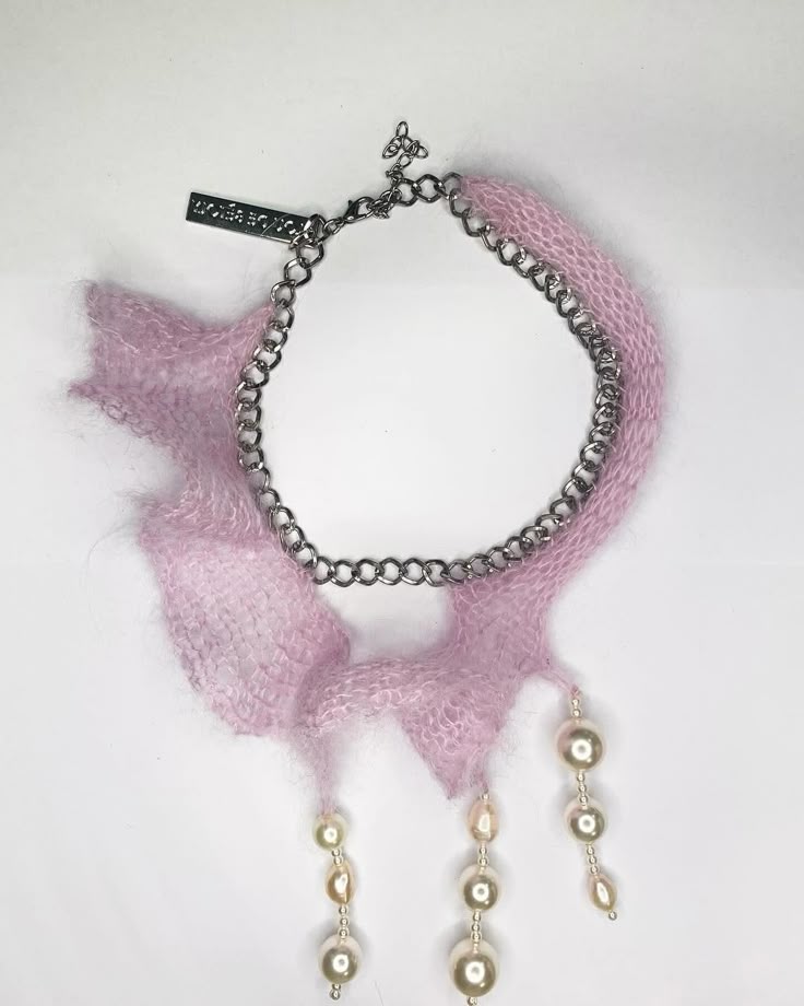 2026 marks a defining shift toward mixed-media handmade jewellery, where creativity knows no boundaries. Artisans are blending different mediums and elements like shells, batteries, metal, and fabric to create jewellery that is texturally rich. Like here in the reference photo, yarn has been knitted around in a metal chain with pearl beads hanging.